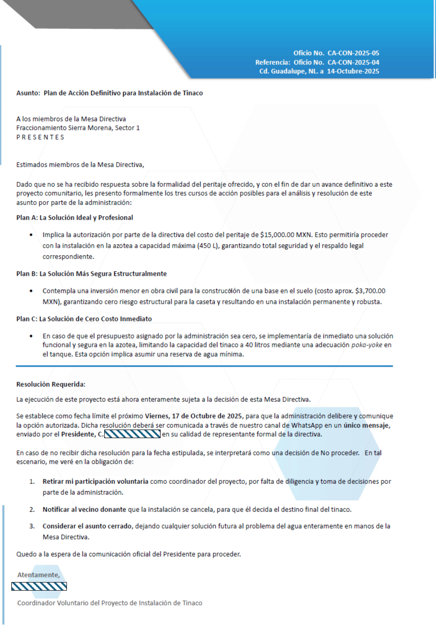 Notificación: Plan de Acción Definitivo para Instalación de Tinaco